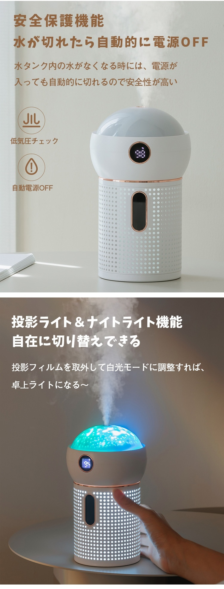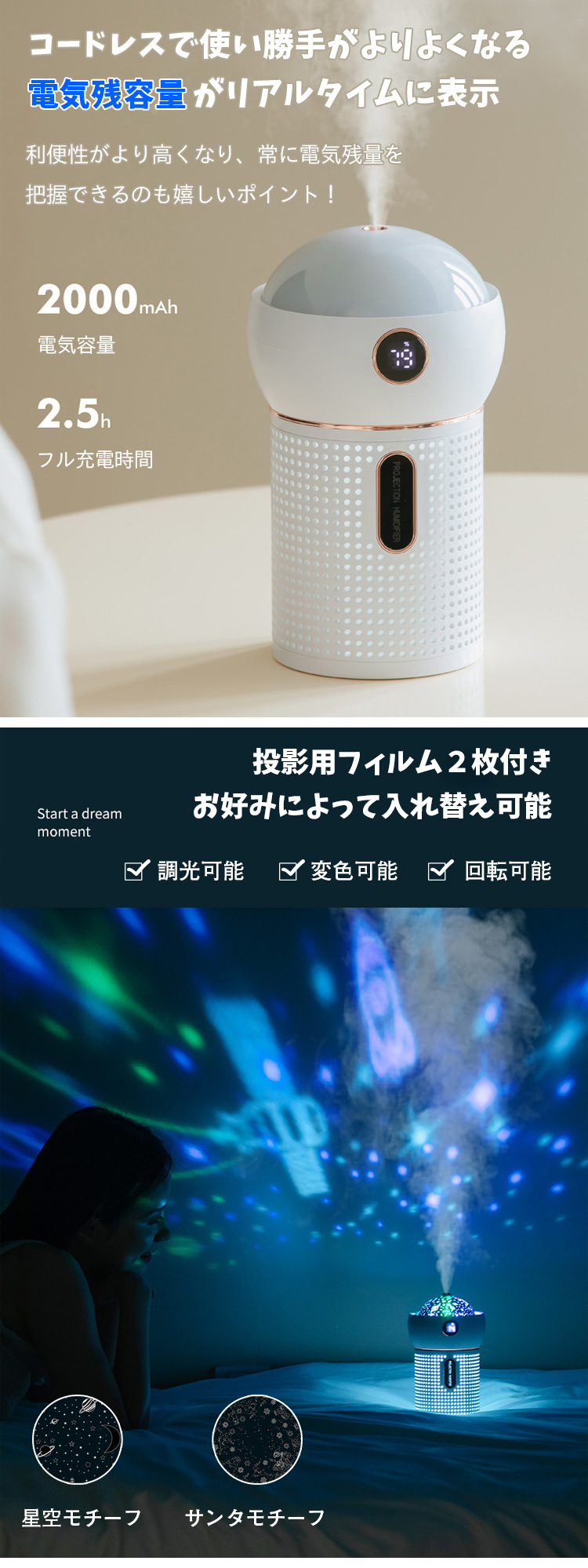 【卓上投影ライト加湿器】投影ライト、ナイトライト、加湿機能、イルミネーション